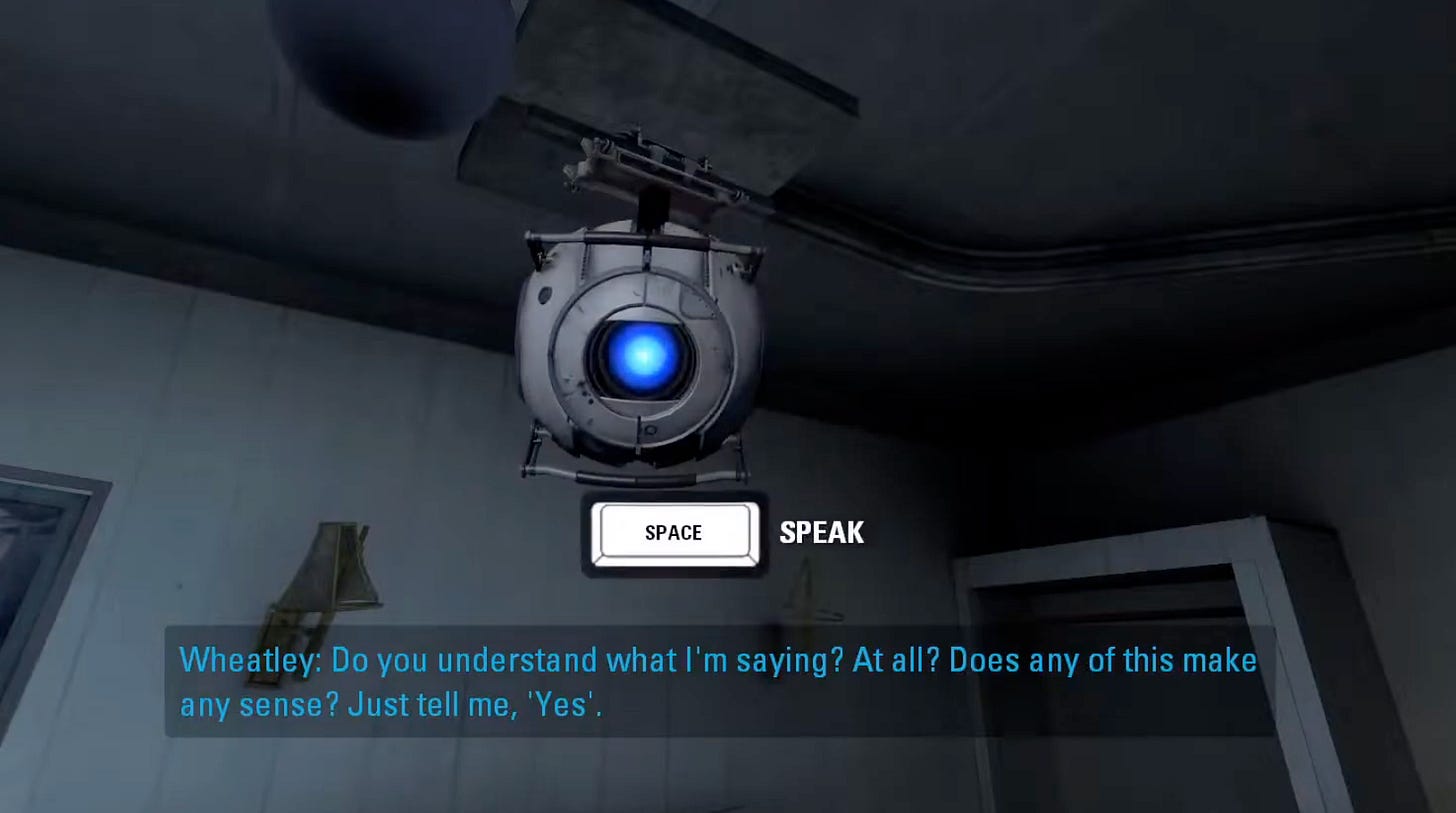 Instantly, my mind flashed back to Portal 2 released in 2011. The game’s introductory scene is a robot companion giving you a check up. He invites you to push spacebar to talk… but instead you jump (like you’d expect to do in every FPS game) and then he laughs at you and implies you have severe brain damage.